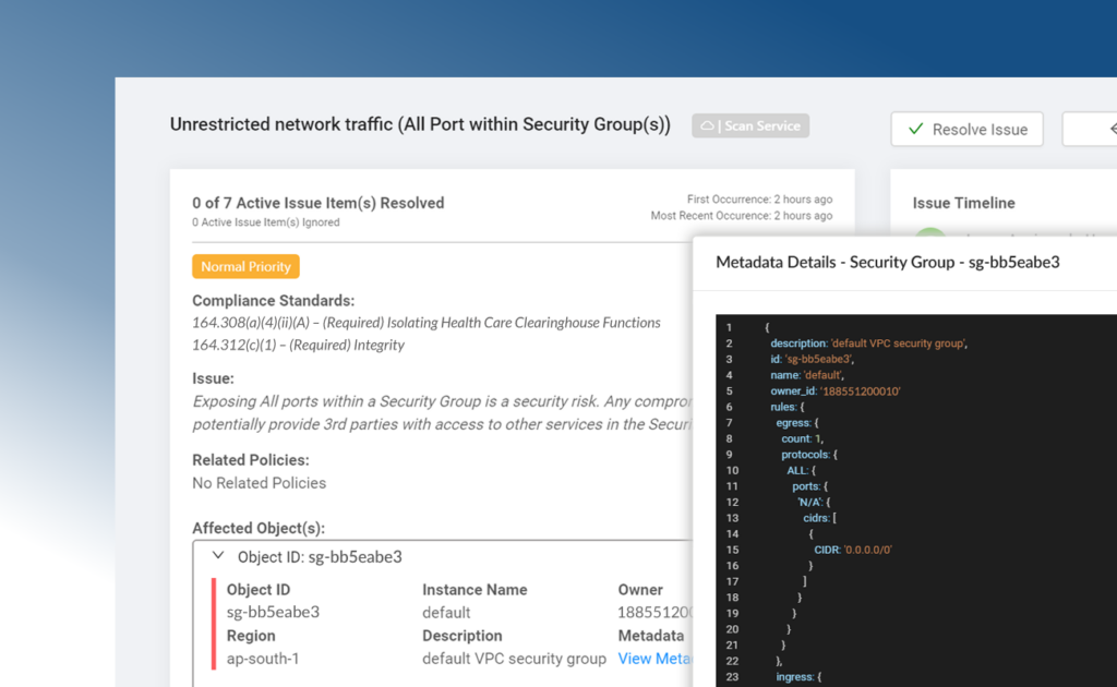 Dash continuously monitors your AWS accounts for HIPAA configuration and security issues. Dash detects compliance concerns in your cloud environment such as unencrypted EBS volumes, audit logging issues and S3 buckets that are open to the public, alerts your team, and provides steps for resolving issues before they become full-blown violations.