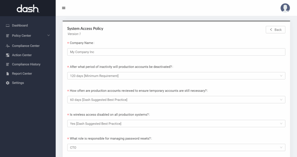 Dash establishes a set of  technical controls based around your organization’s established policies. Security controls are built around cloud services, best security practices, and compliance standards including HIPAA, SOC 2, NIST, ISO 27001/2.